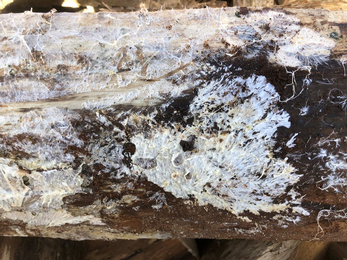Beispiel für Schimmel auf Brennholz. Wenn Sie offensichtlichen Schimmel auf dem Brennholz sehen, werfen Sie das Holz weg. Denn dieses Holz ist nicht zum Verbrennen geeignet. Das Bild stammt von Mapleseed.farm.