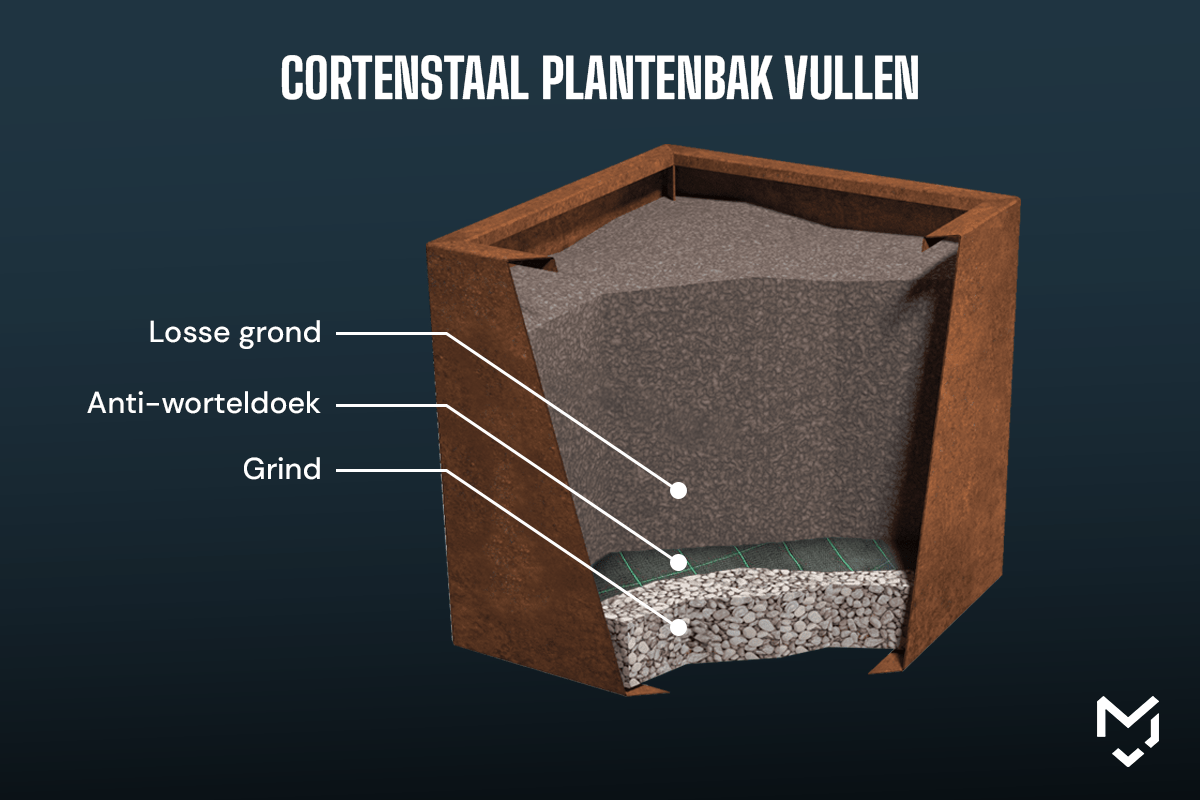 - Es ist wichtig, ein Cortenstahl-Pflanzgefäß richtig zu befüllen und die richtigen Materialien zu verwenden. Auf diese Weise haben Ihre Pflanzen die besten Voraussetzungen zum Wachsen.