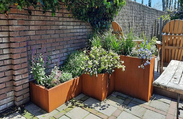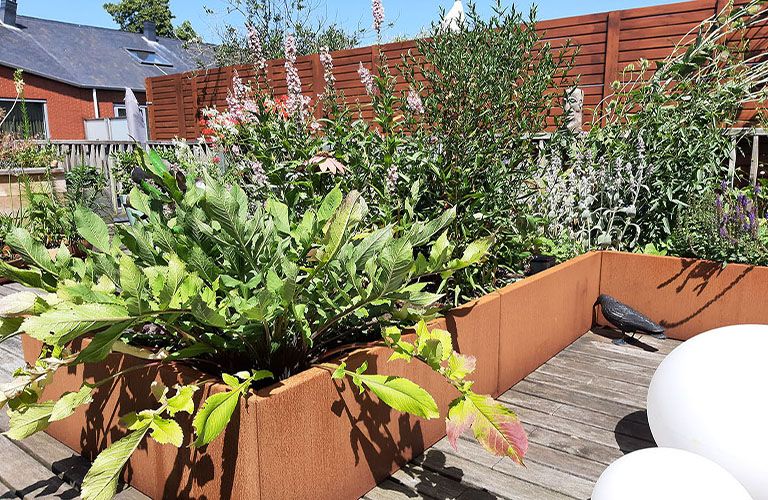 Unser Kunde schuf mehr Privatsphäre, indem er hohe Pflanzgefäße aus Cortenstahl an der Seite der Terrasse installierte. Das ist ideal, wenn man abends auf der Terrasse etwas trinken möchte, aber trotzdem vor den neugierigen Blicken der Nachbarn geschützt sein will. Pflanzgefäße aus Cortenstahl in Kombination mit hohem Gras oder Bambus bilden einen immergrünen Sichtschutz und vermitteln ein sonniges Gefühl. Der Cortenstahl-Pflanzkübel als Gartenzaun hat eine Größe von 1200x300x600 mm (Länge x Breite x Höhe). Dieses Pflanzgefäß nimmt wenig Platz auf dem Boden ein, bietet aber eine maximale Wirkung.