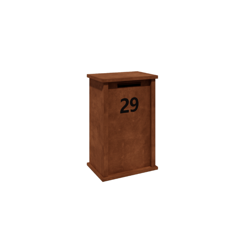 Der Briefkasten misst 60 x 40 x 100 cm und ist aus 1,5 mm dickem Cortenstahl gefertigt. Er verfügt über einen Einwurfschlitz an der Vorderseite sowie eine entnehmbare Klappe an der Rückseite mit Schloss, zu dem standardmäßig zwei Schlüssel gehören. Das Produkt wird mit Montagematerial geliefert, so dass Sie ihn unkompliziert an einem Untergrund mit einer festen Bodenplatte befestigen können.