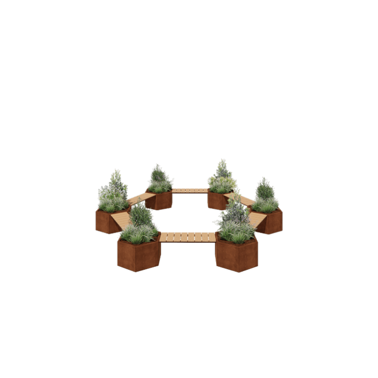 Dieser Pflanzkübel eignet sich ideal, um eine gemütliche Sitzecke zu schaffen, zum Beispiel rund um ein Lagerfeuer oder in einem großzügigen Garten. Dank des modularen Designs können Sie die Form einfach an Ihre Außenanlage anpassen. Die komfortable Bank lädt zum Verweilen und Entspannen ein, während das robuste Cortenstahl Wind und Wetter mühelos widersteht.