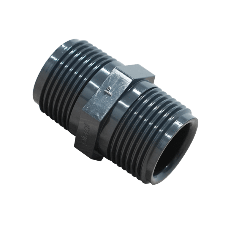 Die Druck-PVC-Doppelnippel mit zwei Außengewindeanschlüssen von 1 Zoll wird verwendet, um Teile innerhalb des Leitungssystems eines Wassertisches miteinander zu verbinden.