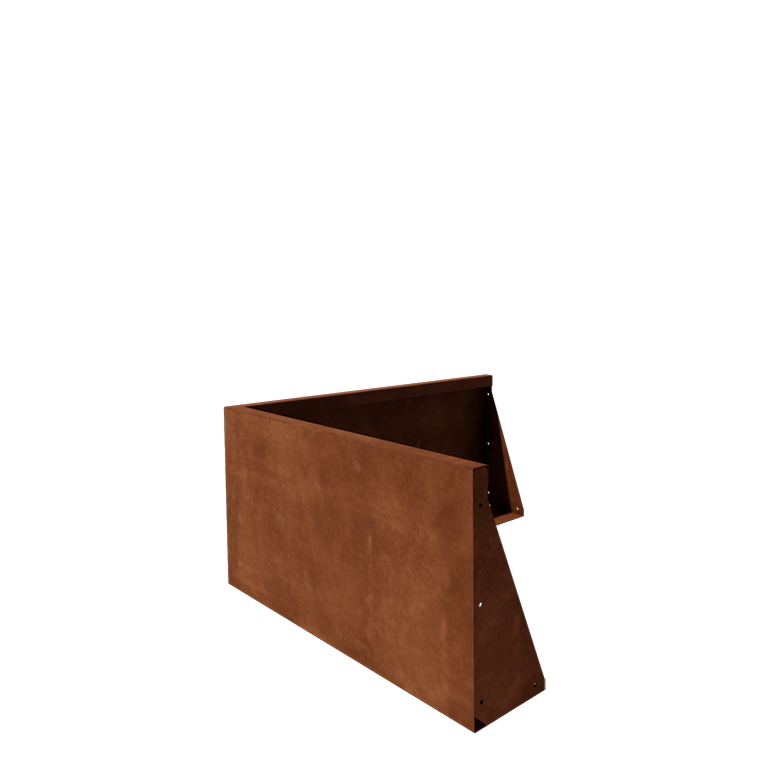 Cortenstahl Stützmauer - Außenecke - 100 x 100 x 50 cm: Robuste 2 mm Wand zur Gestaltung klarer Gartenecken. Sie verbindet sich nahtlos mit weiteren Wänden, steht stabil ohne Verankerung und entwickelt eine warme orange-braune Patina.